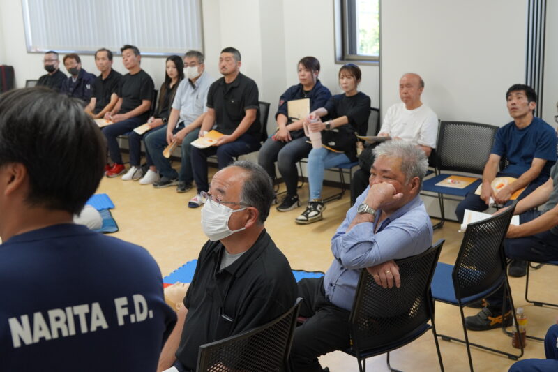 成田市消防署 飯岡分署隊員による指導のもと21名受講していただき、成人に対する心肺蘇生法、AED取扱、異物除去法、止血法を学びました。